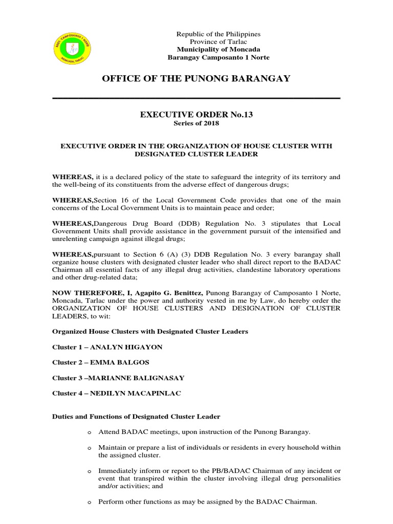 Badac barangay duty officer executive order sample. This is the foundation of effective implementation of laws which leads to a better management and development and of the LGU. Committee on Advocacy Chair Members - Sangguniang Barangay member Kagawad Chair of Women and Family SK Chair School Principal Public or Representative Representative of a Non-Government Organizati. Of 1988 and executive order no.