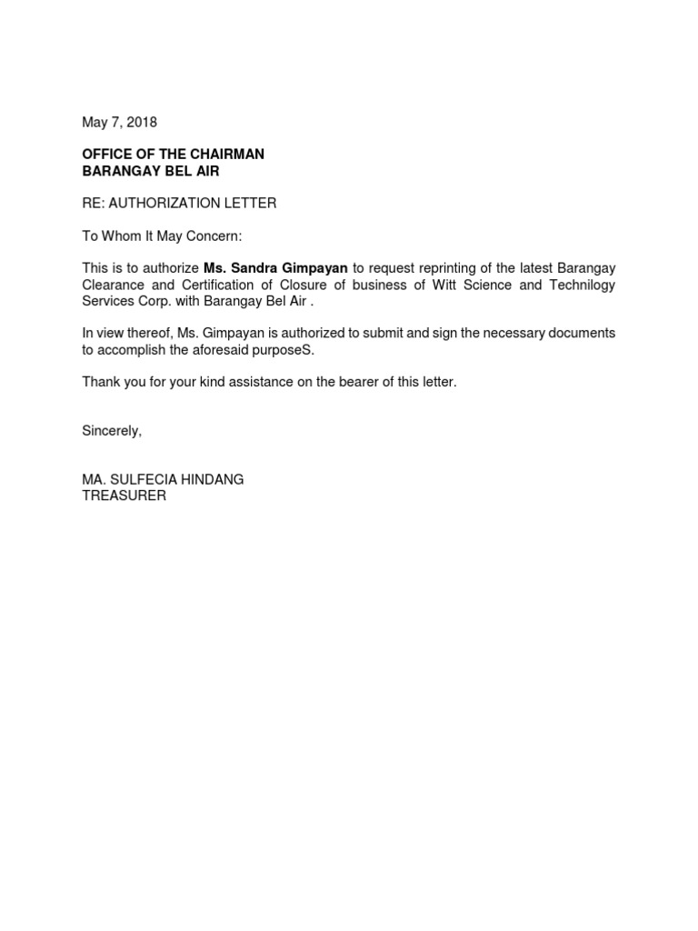 Present the Executive Barangay Budget to the Sangguniang Barangay Deliver the State of the Barangay. A Resolution Authorizing The Barangay Treasurer To Collect The Monthly Household Tanod Contribution RESOLUTION No. This Authorization Letter to claim NBI Clearance is a sample letter that you can give to your bearer to claim your documents.