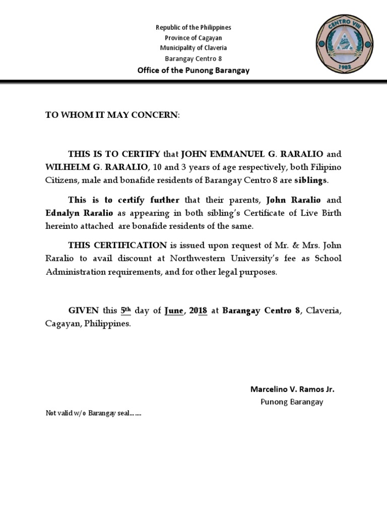 This certification is issued to the above-named person in. This is to certify that _____ is a permanent resident of Barangay _____ and that heshe Name of Barangay is known to me to be of good moral character. Go to your Barangay Hall and tell the Barangay secretary that you want to get a Clearance or Certificate of Residency.
